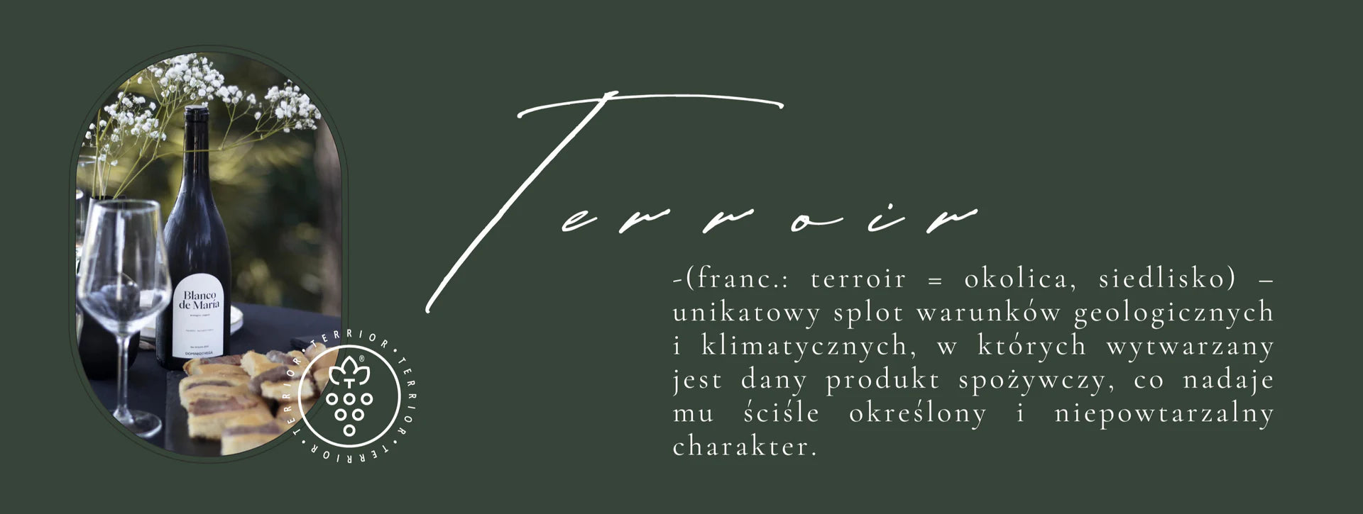 Dzięki terroir kieliszek wina staje się esencją ziemi, właściwą dla jednego tylko miejsca i czasu. Pozwala na podróż w historię danego regionu, na poznanie ludzi, którzy je stworzyli, na – niemal – poczucie promieni słońca, którym zawdzięcza swój niepowtarzalny charakter. Ta podróż to także nauka akceptacji innych smaków i szacunku dla odmiennych kultur. To poznawanie natury, dziedzictwa i sztuki kulinarnej danego miejsca.